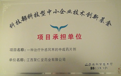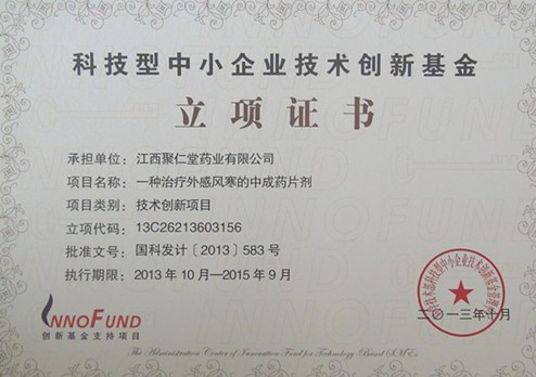 聚仁堂藥業(yè)獲得科技型中小企業(yè)技術(shù)創(chuàng)新基金獎(jiǎng),表明公司自主研發(fā)的“傷風(fēng)停片”項(xiàng)目得到了國(guó)家的肯定和支持,這對(duì)聚仁堂全體員工是一個(gè)極大的鼓勵(lì)。有了70萬元技術(shù)創(chuàng)新基金的支持,將對(duì)聚仁堂藥業(yè)產(chǎn)品的持續(xù)創(chuàng)新,科技研發(fā)力度的提升,創(chuàng)造出更具先進(jìn)性的產(chǎn)品起到積極的推動(dòng)作用。