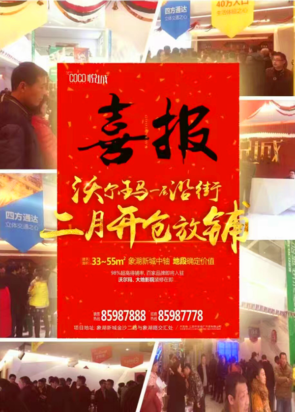 俗話說“有錢存銀行,不如買間鋪”。如今,位于南昌象湖繁華地段——象湖新城金沙二路與象湖路交匯處的COCO悅城開倉放鋪,33-55㎡沃爾瑪一層沿街商鋪全城僅限28席,98%超高得鋪率,先到先得。各位來買鋪的朋友,注意了!