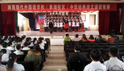 2013年1月29日下午,南昌現(xiàn)代外國語學(xué)校(象湖校區(qū))在演藝廳舉行了中華經(jīng)典詩誦讀比賽。全新的誦讀形式,訓(xùn)練有素的朗誦水平,精美的舞臺設(shè)計,獨特的節(jié)目編排讓全校師生共享了一場視聽的饕餮盛宴。比賽朗誦的詩題材廣泛,既有中華經(jīng)典的,也有現(xiàn)代的;既有歷代文豪的,也有領(lǐng)袖人物的。參賽選手所誦讀的中華經(jīng)典詩文縱貫古今,氣勢磅礴,集中抒發(fā)了對祖國、對中華文化的熱愛之情,對如今生活的珍惜和贊頌之情。