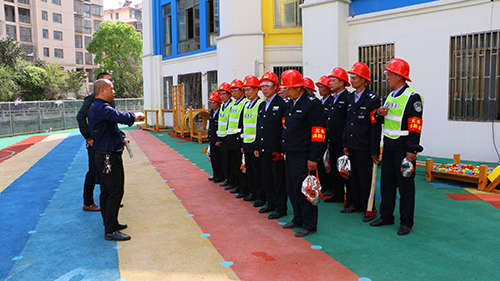 為保證演習(xí)順利進(jìn)行,聚龍物業(yè)提前熟悉勘察場地,并制定出詳細(xì)健全的演習(xí)方案。演習(xí)當(dāng)天下午14:00,聚龍物業(yè)的保安在保安室換上安全頭盔、消防服、防毒面罩等,并拿好消防器材后,全員到樓下操場進(jìn)行清點集合。隨即前往金沙園、象湖園、芳草園開展消防聯(lián)合演習(xí)。